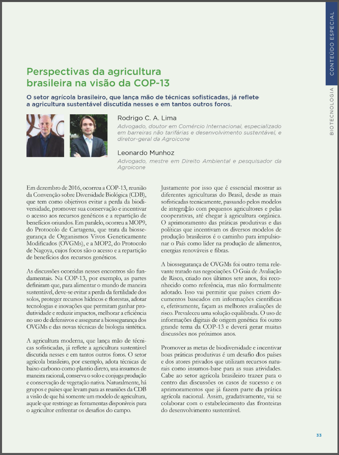 Promover as metas de biodiversidade e incentivar boas práticas produtivas é um desafio dos países e dos atores privados que utilizam recursos naturais como insumos-base para as suas atividades. Cabe ao setor agrícola brasileiro trazer para o centro das discussões os casos de sucesso e os aprimoramentos que já fazem parte da prática agrícola nacional. Assim, gradativamente, vai se colaborar com o estabelecimento das fronteiras do desenvolvimento sustentável.